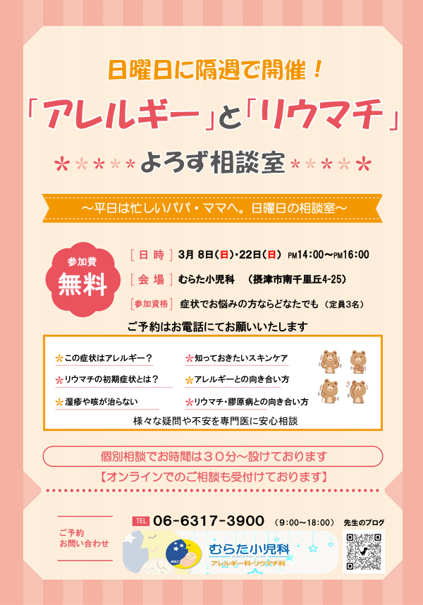 2026年3月3日 お知らせ・イベント 3月の「アレルギーとリウマチの相談室」開催日程のご案内。 今月の相談室は3月8日(日)・22日(日)に開催いたします。 参加費は無料です。 平日はお忙しいお父さま・お母さま、お気軽にご参加くださいませ。 お知らせ一覧へ戻る